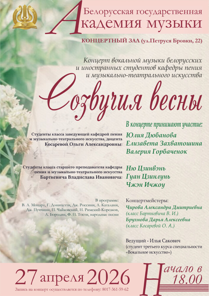 Концерт вокальной музыки белорусских и иностранных студентов кафедры пения и музыкально-театрального искусства «Созвучия весны»
