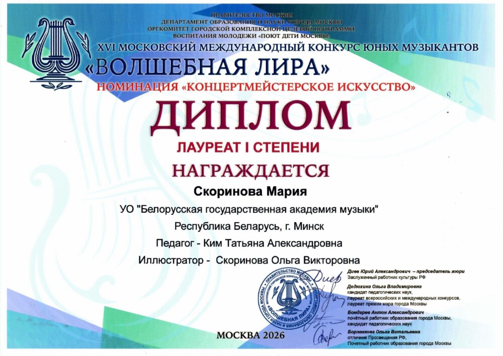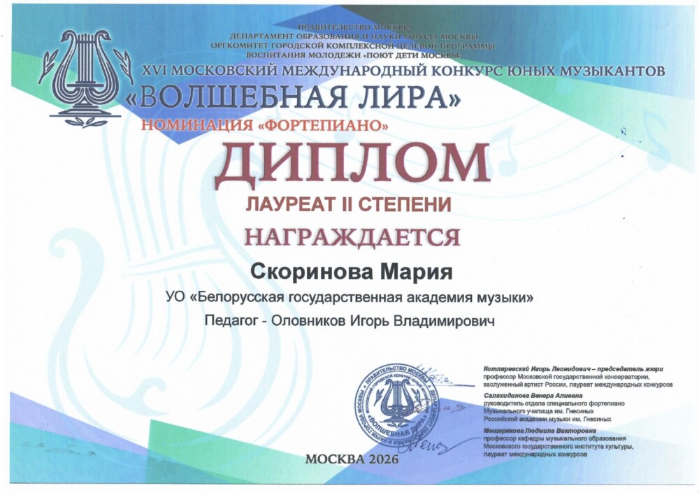 З 1 лютага да 30 сакавіка 2026 г. праводзіўся XVI Маскоўскі міжнародны конкурс юных музыкантаў “Чароўная ліра” (г.Масква, Расія).