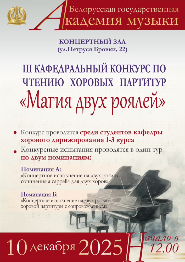 Конкурс адбудзецца 10 снежня 2025 г. па адрасе: г. Мінск, вул. П.Броўкі, 22, Канцэртная зала (3 корпус, аўд. 214).