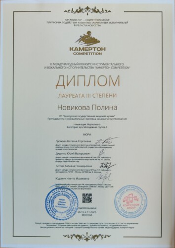 С 26 октября по 2 ноября 2025 года в г.Москва (Российская Федерация) проводился ХI Международный конкурс инструментального и вокального исполнительства «КАМЕРТОН COMPETITION».