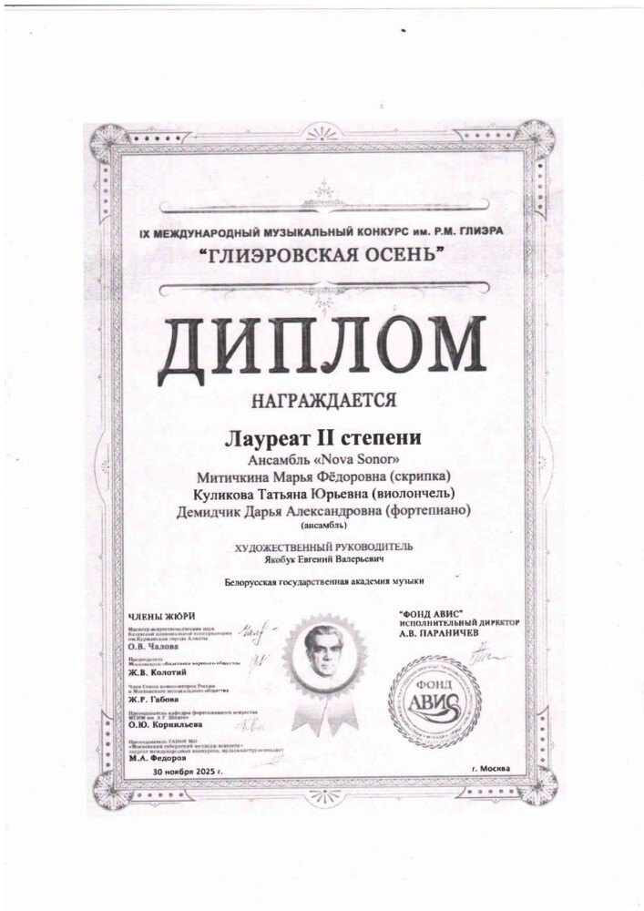 30 ноября 2025 года проводился IX Международный конкурс им. Р.М.Глиэра (г. Москва, РФ). Студенты 2 курса оркестрового факультета кафедры струнных смычковых инструментов и камерного ансамбля Марья Митичкина (скрипка), Татьяна Куликова (виолончель) и студентка фортепианного и композиторско-музыковедческого факультета Дарья Демидчик получили Диплом Лауреата II степени в номинации «Ансамбль», художественный руководитель Евгений Якобук.