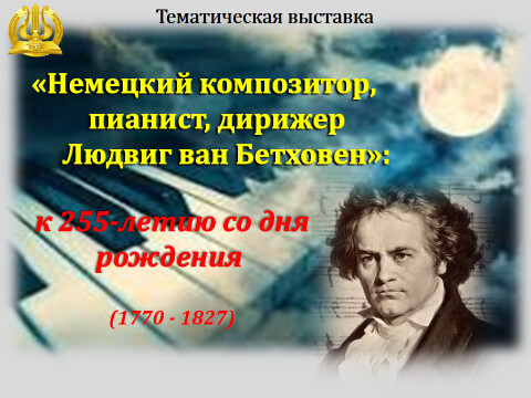 Библиотека Белорусской государственной академии музыки представляет тематическую выставку «Немецкий композитор, пианист, дирижер Людвиг ван Бетховен»: к 255-летию со дня рождения (1770 – 1827). Л. Бетховен — выдающийся композитор венской классической школы, пианист, дирижер, педагог. Его музыка, обладая уникальной универсальностью и узнаваемостью, а также лирической выразительностью и драматической мощью, вдохновляет людей и вызывает глубокие чувства, что подтверждает её вечную актуальность. Жиз