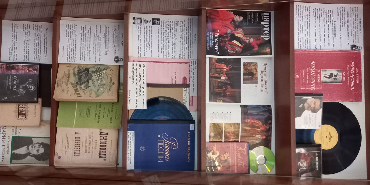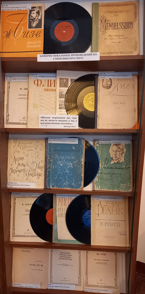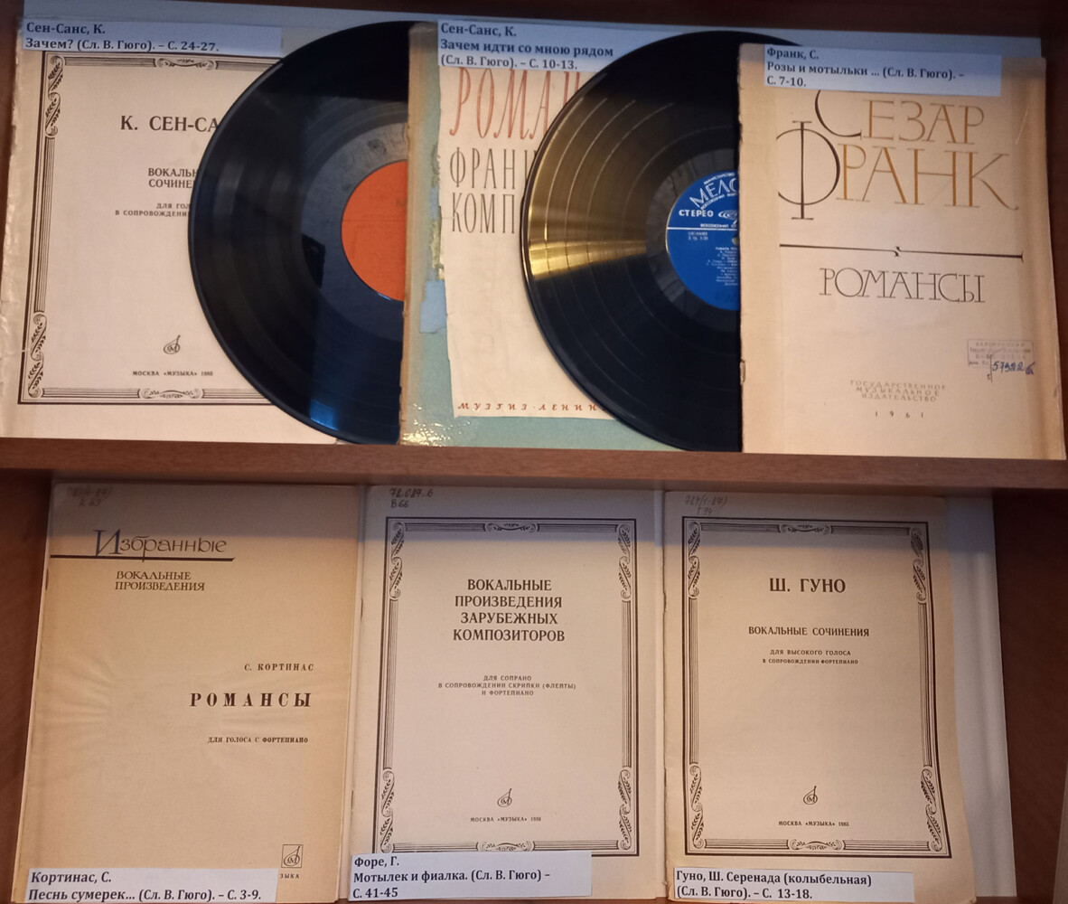 Особого внимания заслуживают уникальные издания нот — переложения для пения с фортепиано оперы А. Понкьелли «Джоконда» (1886) издательства П. Юргенсона конца XIX века и партитуры вступления к опере Ц. Кюи «Анджело» (1906) издательства «W. Bessel&C.» начала XX века. Интерес представляют нотные издания камерно-вокальных лирических произведений Ф. Листа, Г. Форе, К. Сен-Санса, С. Рахманинова, Ш. Гуно на стихи В. Гюго.