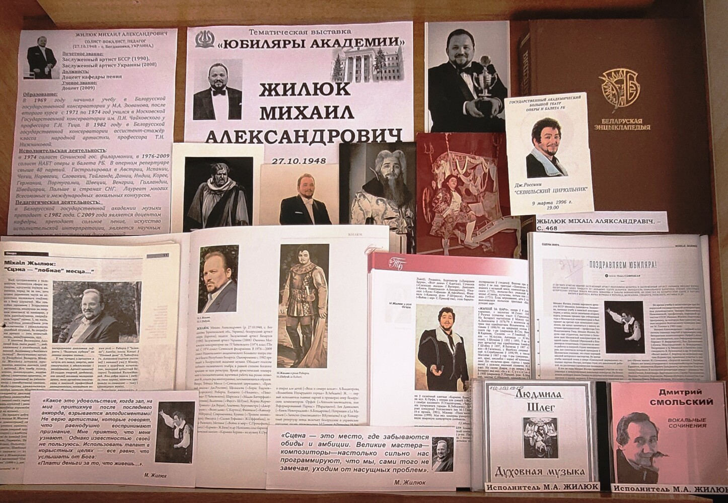 Библиотека Белорусской государственной академии музыки представляет тематическую выставку из цикла «Юбиляры академии», приуроченную к юбилейным датам корифеев белорусского музыкального искусства и педагогики: Владимира Ивановича Тарашкевича (05.07.1948) и Михаила Александровича Жилюка (27.10.1948).