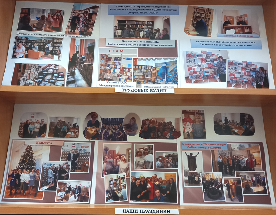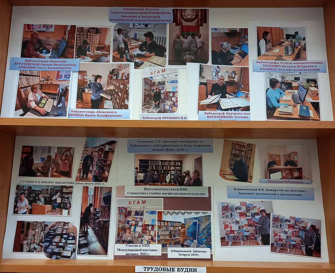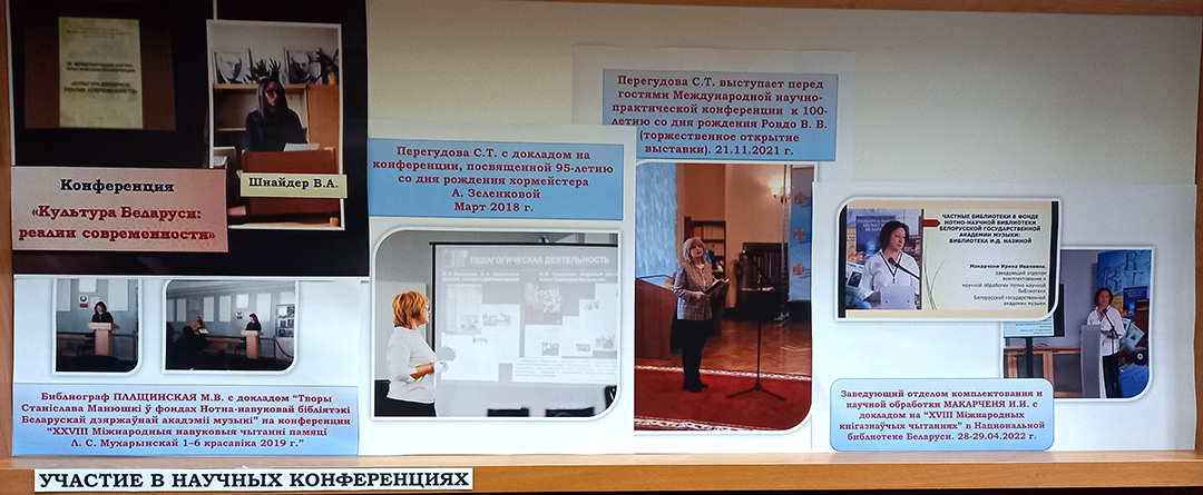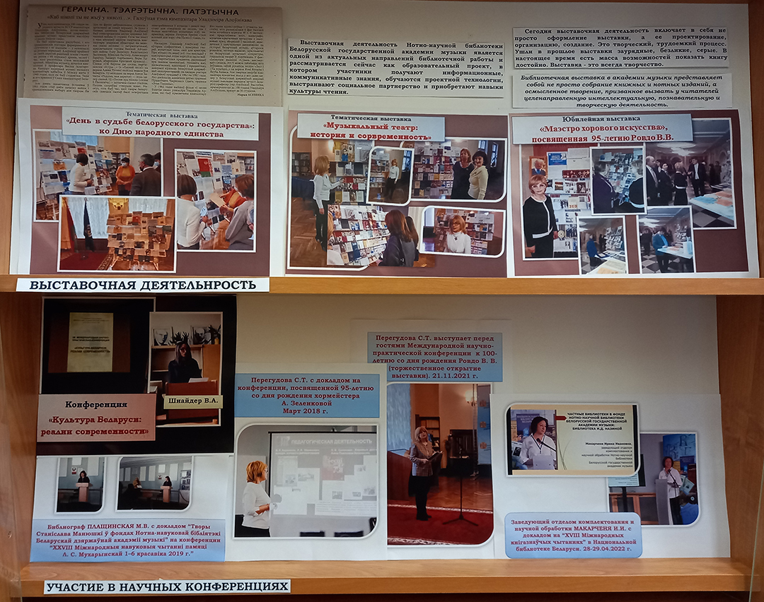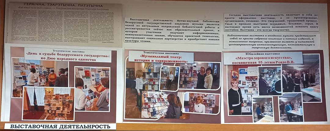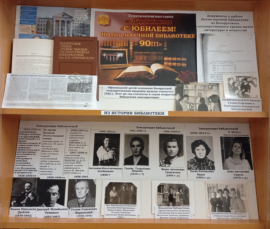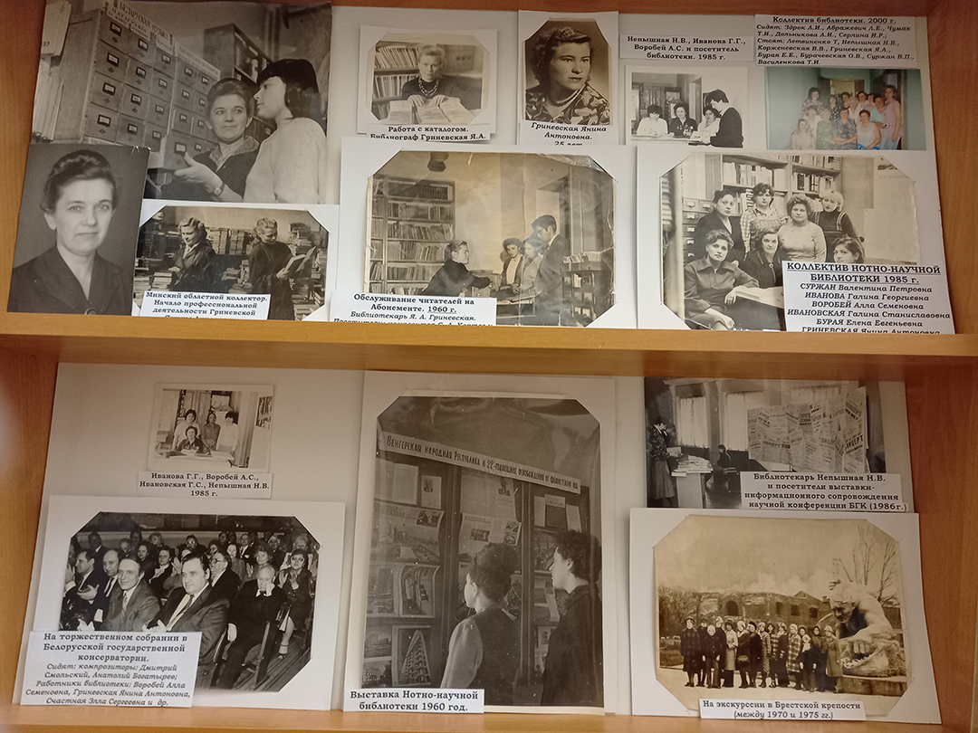 На выставке представлены архивные документы по истории и становлению библиотеки из фонда Белорусского государственного архива-музея литературы и искусства, Минского областного архива, воспоминания преподавателей академии музыки, публикации сотрудников библиотеки в материалах международных конференций, факсимильное издание «Повязь мастацтваў: камерныя вакальныя творы беларускіх кампазітараў XX ст. на словы Янкі Купалы і Якуба Коласа» (2017 г.). Большую часть экспозиции занимают фотодокументы, по которым можно проследить историю Нотно-научной библиотеки с основания и до наших дней.