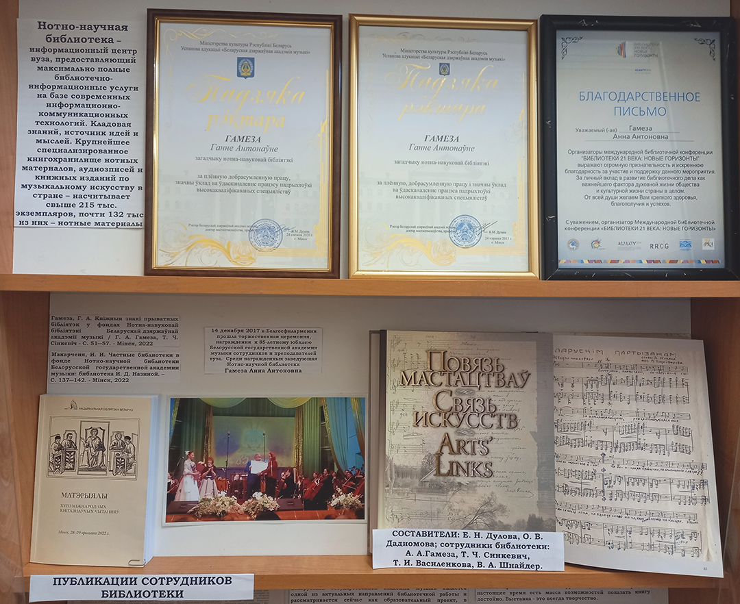 Сегодня Нотно-научная библиотека – информационный центр вуза, предоставляющий максимально полные библиотечно-информационные услуги на базе современных информационно-коммуникационных технологий. Крупнейшее специализированное книгохранилище нотных материалов, аудиозписей и книжных изданий по музыкальному искусству в стране насчитывает свыше 215 тыс. экземпляров, почти 132 тыс. из них – нотные материалы. Отдельный фонд составляют мемориальные библиотеки видных деятелей белорусского музыкального искусства – преподавателей консерватории-академии, в частности доктора искусствоведения, профессора, этномузыколога И. Д. Назиной, композитора и педагога, заслуженного деятеля искусств БССР М. И . Шнейдермана, композитора и дирижера, народного артиста БССР А. В. Богатырева, пианистки и педагога, заслуженного работника высшей школы БССР, заслуженного деятеля искусств Беларуси И. А. Цветаевой, заслуженного артиста БССР М. А. Бергера и др. С 2014 г. в отдельную коллекцию выделен Фонд рукописных, неопубликованных материалов и редких изданий, в который включены произведения печати XIX – первой половины XX вв. и нотные рукописи белорусских композиторов, и на сегодняшний день этот фонд насчитывает свыше 13 тыс. названий. Идя в ногу с академией музыки, библиотека все эти годы своевременно и четко реагировала на происходящие изменения в учебном процессе, постоянно совершенствовала информационно библиотечное обслуживание читателей.